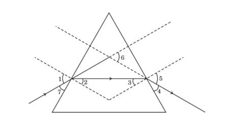 Draw a ray diagram to show the refraction of a ray of light passing through an equilateral glass prism. Mark the angle through which the emergent ray bends from the direction of the incident ray and also name it.
