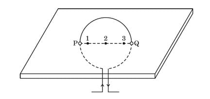 (a) Make this diagram on your answer sheet and draw three magnetic field lines, one each passing through the points 1 (near P), 2 (at the centre of the loop) and 3 (near Q).
