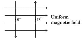 In this field, an electron (e–) and a positron (p+) enter as shown. The electron and positron experience forces :