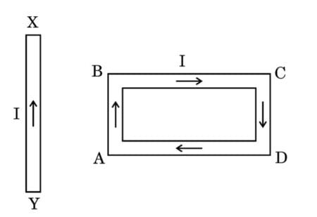 A rectangular loop ABCD carrying a current I is situated near a straight conductor XY, such that the conductor is parallel to the side AB of the loop and is in the plane of the loop. If a steady current I is established in the conductor as shown, the conductor XY will
